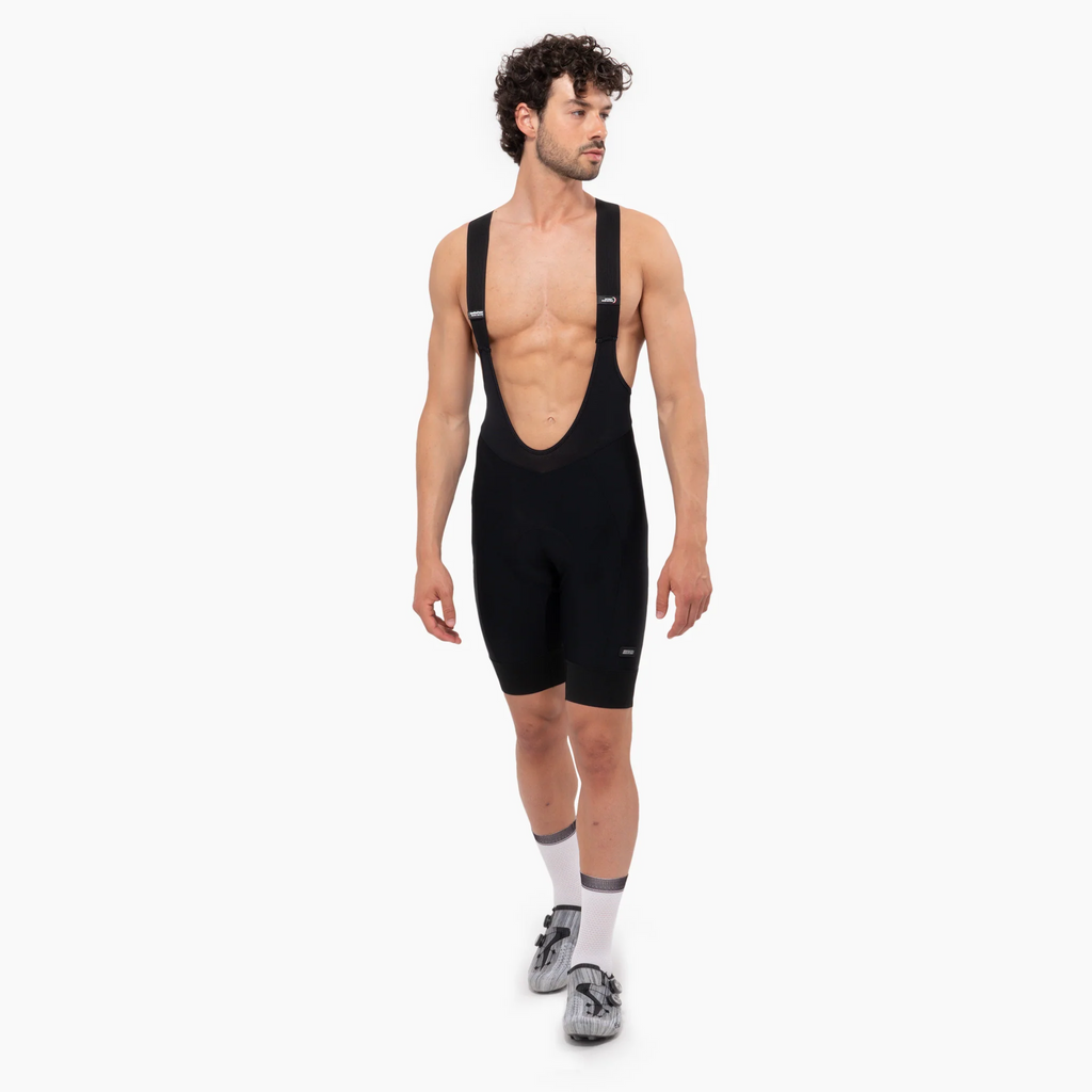 The bib shorts come with active tension mono‑elastic straps and 75 mm leg grippers to keep the fit secure and stable while riding.